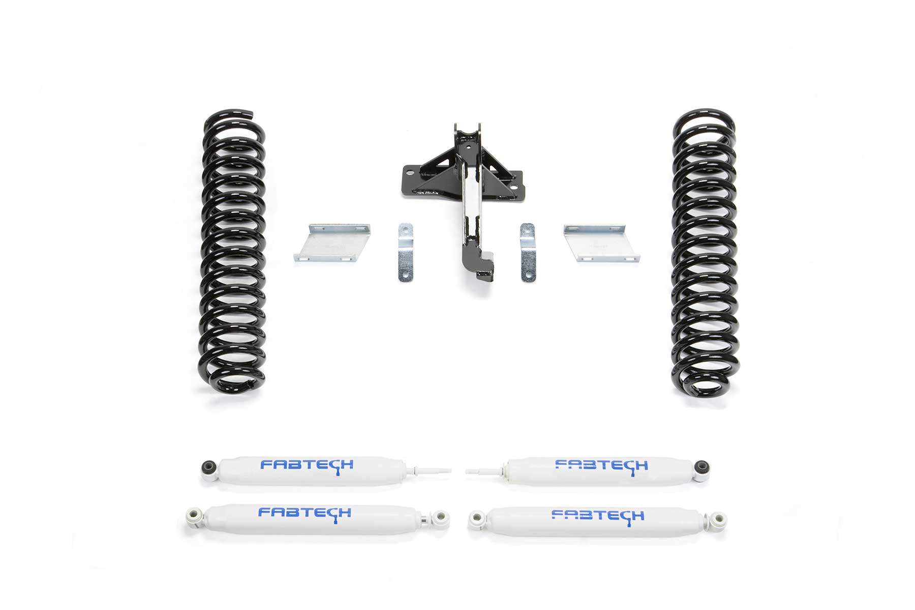 This Super Duty lift kit is perfect for the enthusiast looking to run oversized tires and wants additional wheel travel for offroad use. With the large Super Duty wheelwell openings and this quality 2.5in lift kit, you can run 35in tall tires with ease. Fabtech's coil springs retain the factory load carrying capacity while providing increased suspension travel. The coil springs and associated bracketry allow for an additional inch of compression travel over stock without binding the suspension. This extra travel helps when offroading in rugged terrain. Sway bar drop brackets are included to reposition the front bar so that the link ends do not go over center at full droop and cause bind. The brake lines are relocated down on the frame with extension brackets to eliminate the possibility of overstretching the lines throughout the new travel range. Fabtech provides extension brackets rather than longer brake lines to keep the factory brake system sealed for fast and trouble-free installation. This suspension kit utilizes the factory bump stops without extensions. This allows for more travel with the Fabtech coil springs and components. Typically, once a Super Duty is lifted the front axle is pushed to one side due to the length of the track bar and the location. To address this issue Fabtech provides a heavy-duty 1/4in thick steel Track Bar mount. It repositions the track bar and front axle under the vehicle to the factory specifications. This provides proper tracking of the front and rear axle for excellent highway manners. This Super Duty lift kit includes Fabtech Performance shocks. They are a twin tube shock that will provide a good highway ride with the ability to tackle offroad. With the installation of this 2.5in lift the vehicle's stance front to rear will be nearly flat compared to the factory nose-down appearance. For owners that want to retain more of the factory nose-down appearance, Fabtech offers an optional 4in rear block kit (FTS22214). The 4in blocks